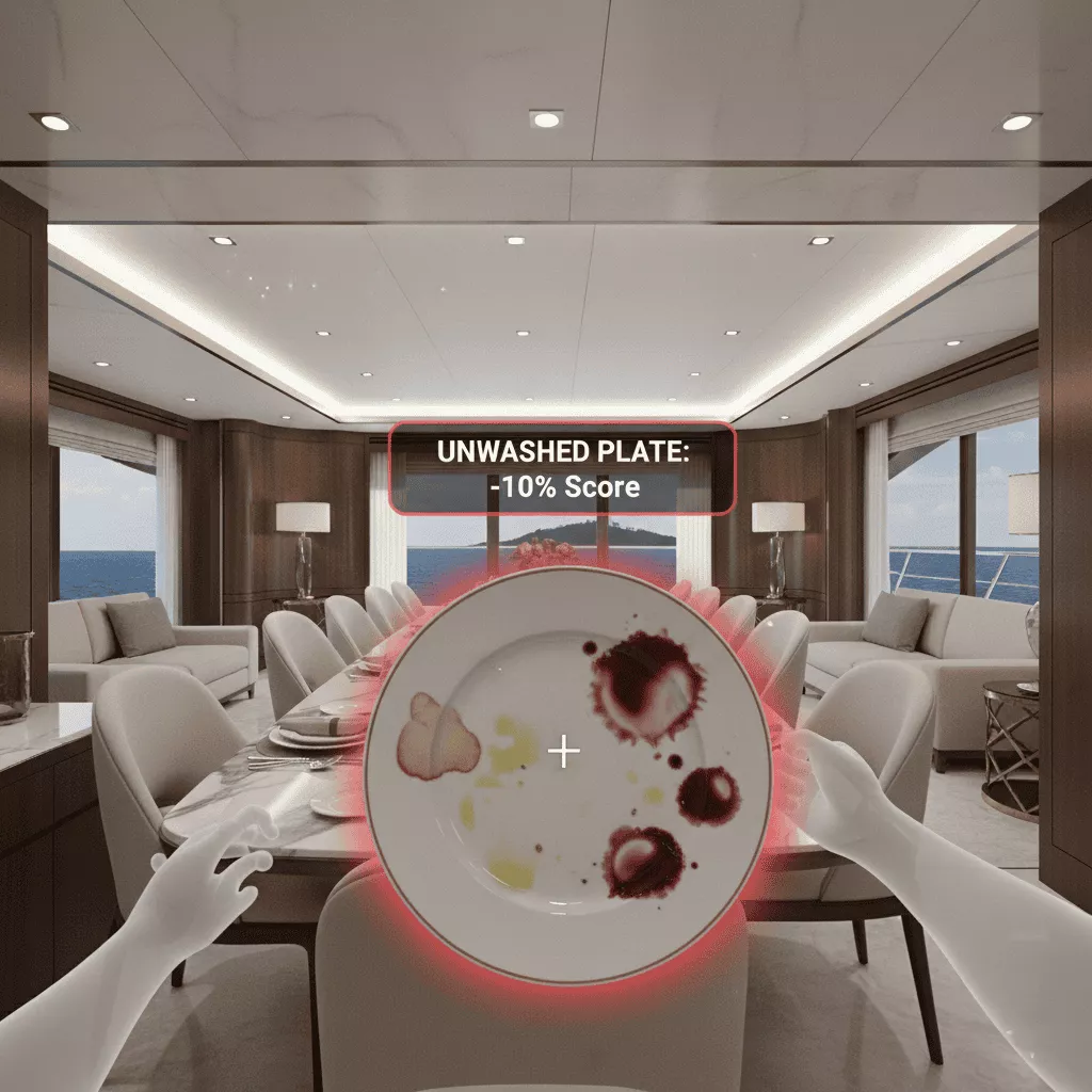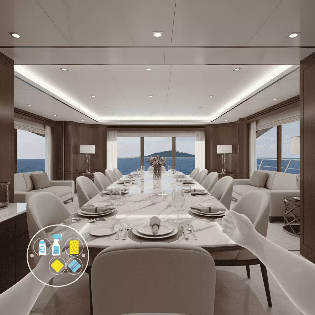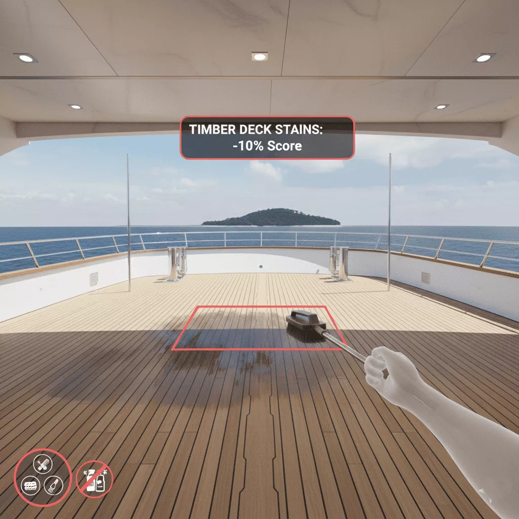 🎮 First-Person Virtual Training Experience realistic superyacht environments. Detect flaws, select correct products, and complete cleaning tasks in immersive first-person view simulations. Practice perfect technique without risk.