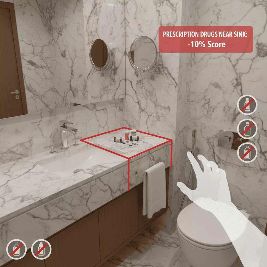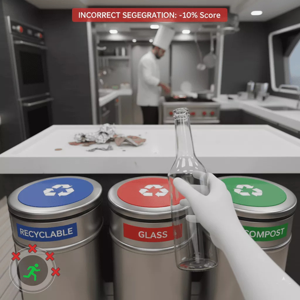 Scenario 3: Cleaning Sequence First-person bathroom cleaning from start to finish. Follow proper top-to-bottom, clean-to-dirty sequence. Scored on: correct order, thoroughness, technique, time management.