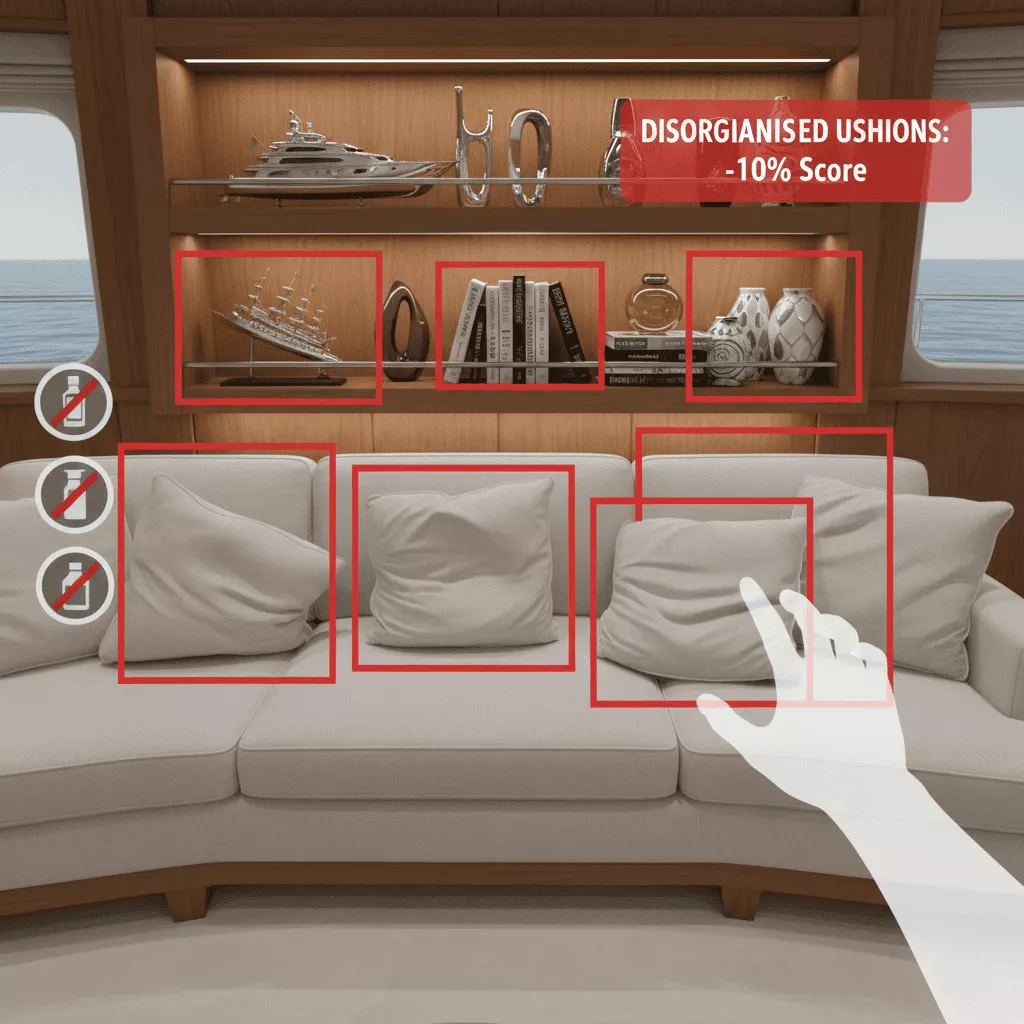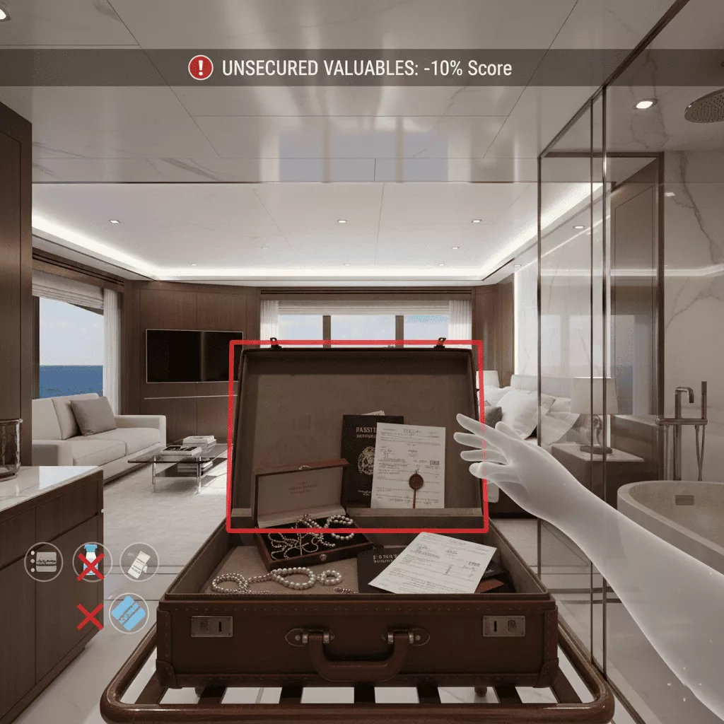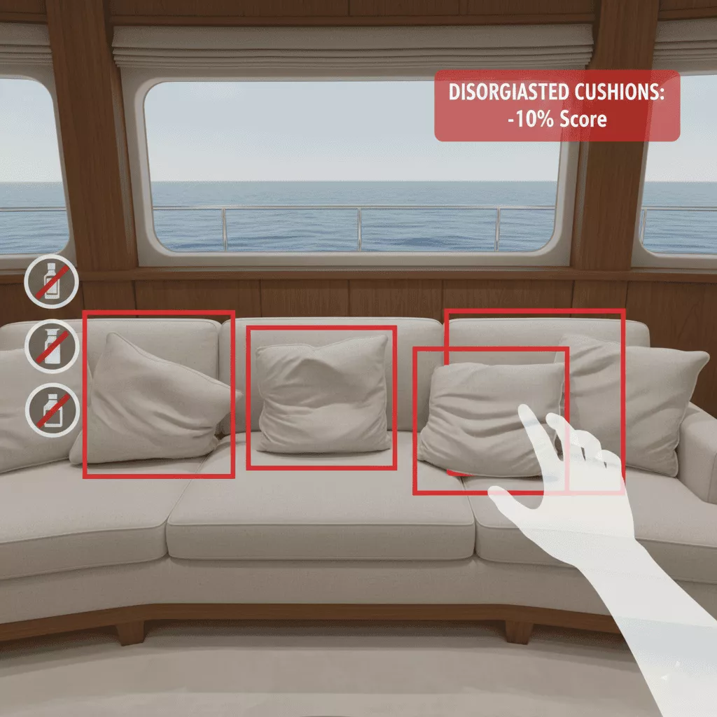 Scenario 1: Flaw Detection First-person view walking through a “completed” guest cabin. Trainee must identify 12 flaws (water spot on mirror, cushion misaligned, vacuum lines uneven, etc.). Instant feedback on each detection.